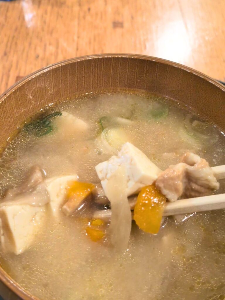 一緒にいただいた豚汁はやさしい味わいながら旨味がたっぷり。具材が細かめにカットされているので口に運びやすく、作り手の配慮を感じました。