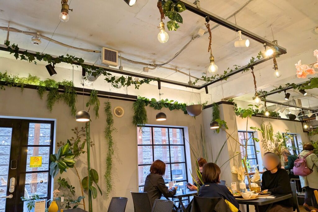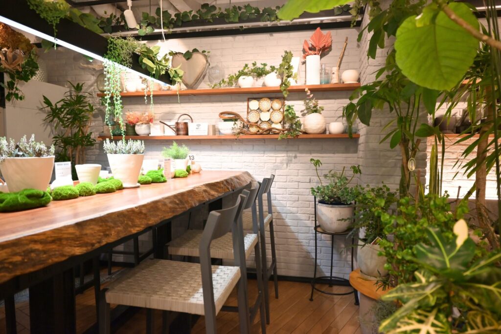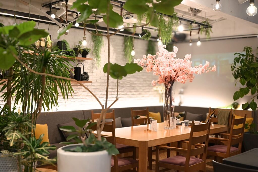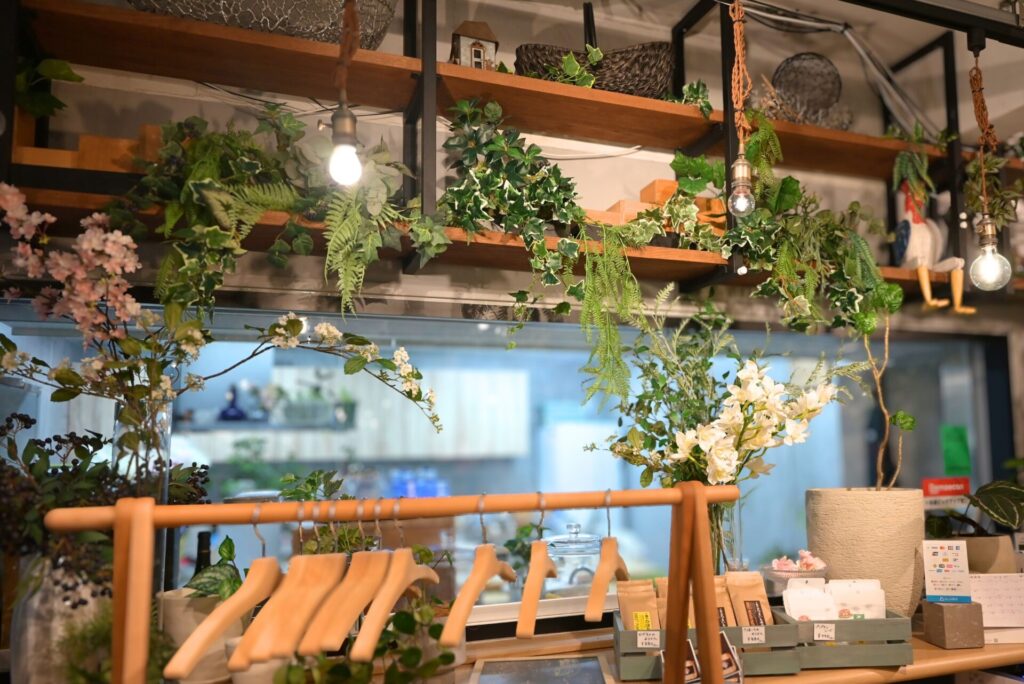 印象的なのは、店内に自然になじむ植物やお花の存在。こちらのお店は、花や緑を扱う会社「花匠五季」が運営しており、店内の雰囲気にもその世界観が表れていました。観葉植物やディスプレイがさりげなく配置されていて、食事の時間をゆったり楽しめるのも魅力です。