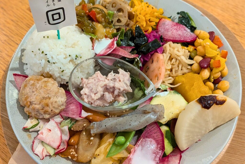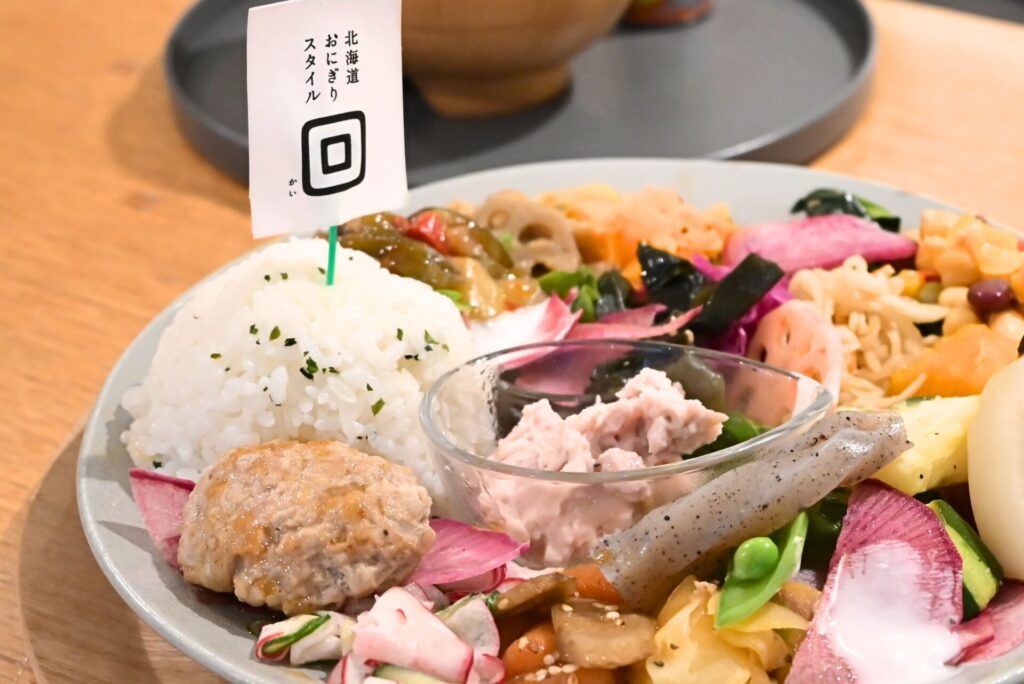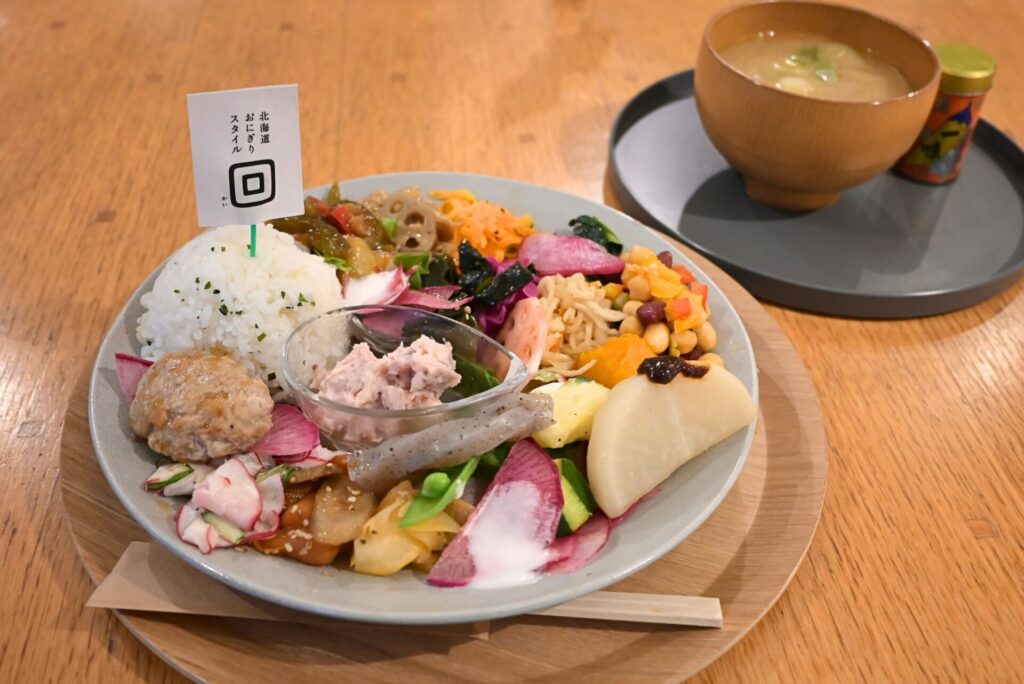 「北海道おにぎりスタイル回」は、おにぎりを中心に、野菜たっぷりのおかずや豚汁などが楽しめるカフェです。お米を主役にしたメニューがそろっているので、グルテンフリー派にとっても比較的選びやすい構成になっています。
