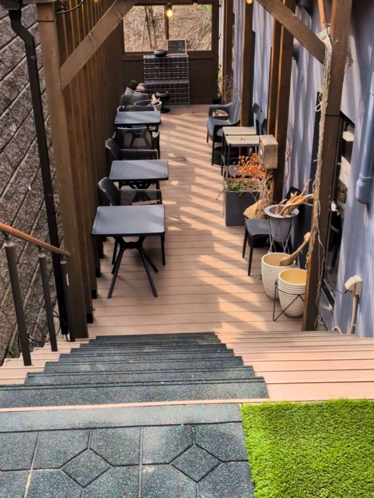 地下入口へと続く階段下には、テラス席も用意されています。天気の良い日にはこちらでお食事を楽しむのも気持ち良さそうです。