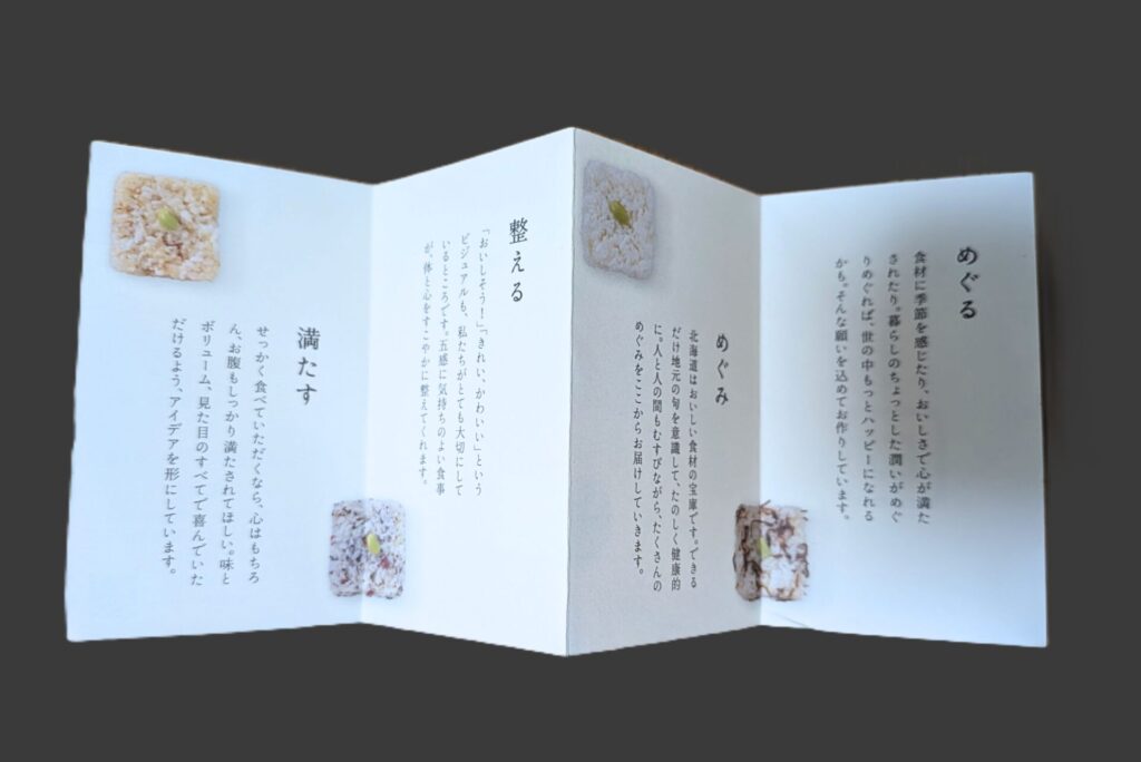 「回(かい)」という店名には、暮らしのちょっとした潤いがめぐること、北海道のおいしい恵みを届けること、見た目も含めて心と体を整えること、お腹もしっかり満たしてほしいこと――そんな思いが込められているのだそうです。